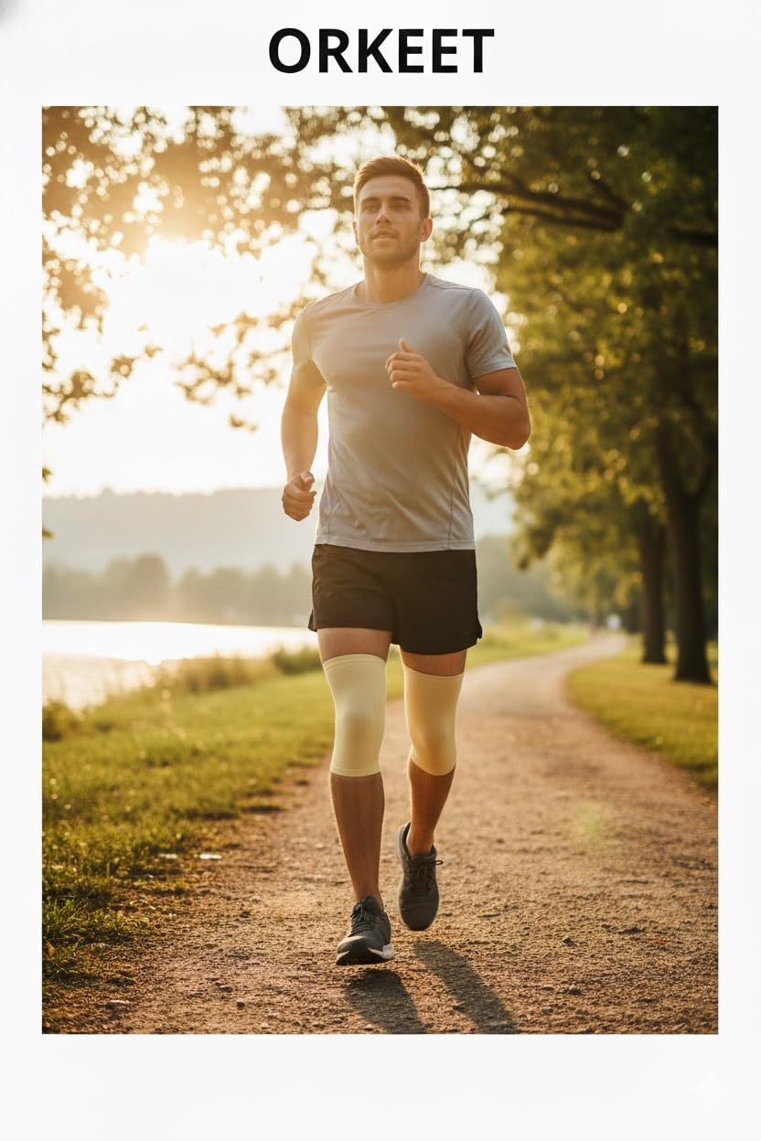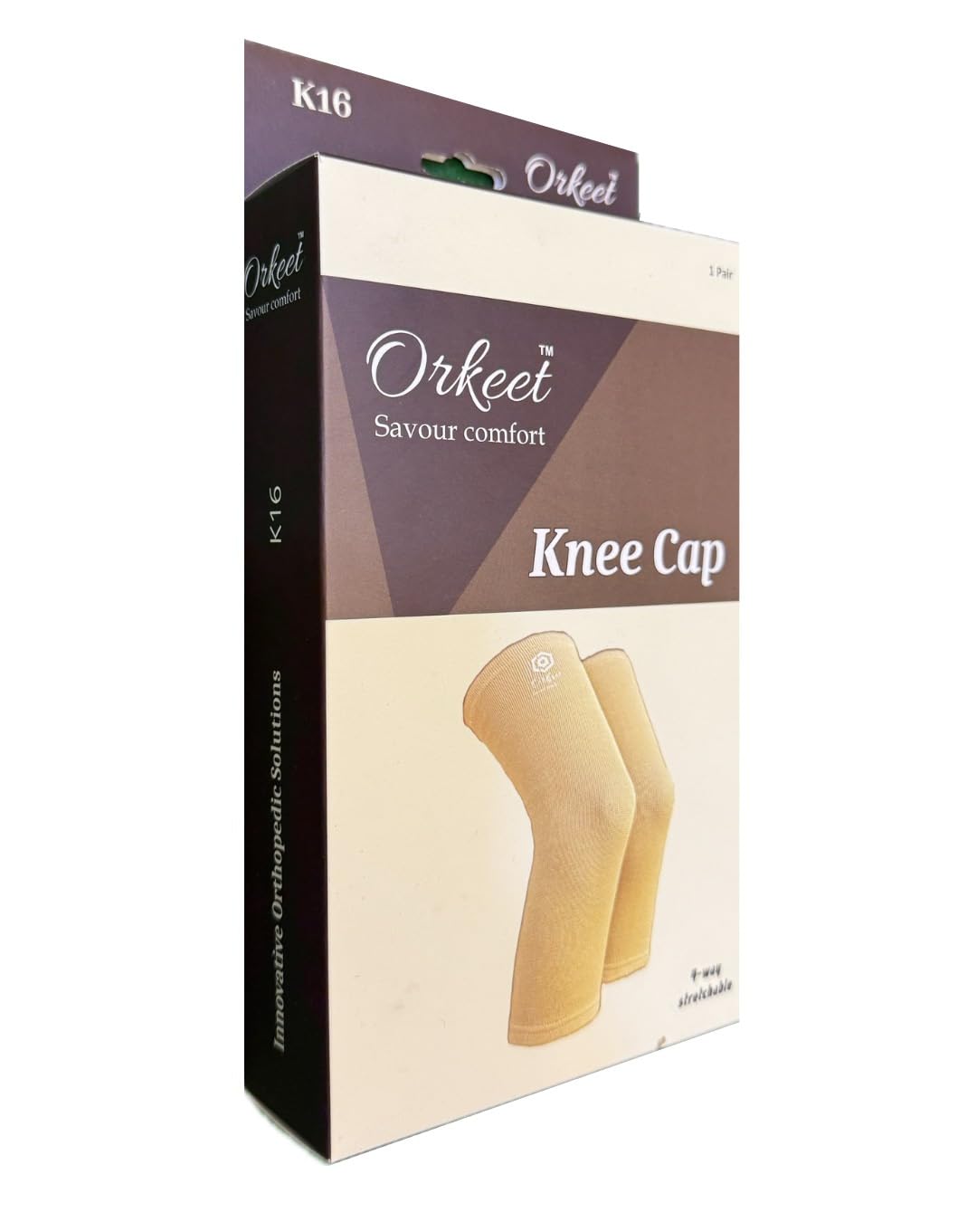 | features | PAIN RELIEF & JOINT SUPPORT: Orkeet knee cap provides targeted compression to relieve knee pain, improve joint stability, and prevent injuries during physical activities and daily movement., VERSATILE USE: Ideal for running, gym workouts, sports activities, arthritis management, and recovery from sprains or strains, offering reliable support for active lifestyles., 4-WAY STRETCHABLE FABRIC: Features breathable, highly stretchable material that moves with your body, ensuring all-day comfort, flexibility, and optimal support without restricting movement., UNIVERSAL FIT: Available in multiple sizes (S, M, L, XL) suitable for both men and women, with lightweight design at 200 grammes per pair for comfortable extended wear., COMPACT DESIGN: Measures 10 × 15 × 3 centimetres, providing a slim profile that fits discreetly under clothing whilst delivering maximum knee protection and stability. |